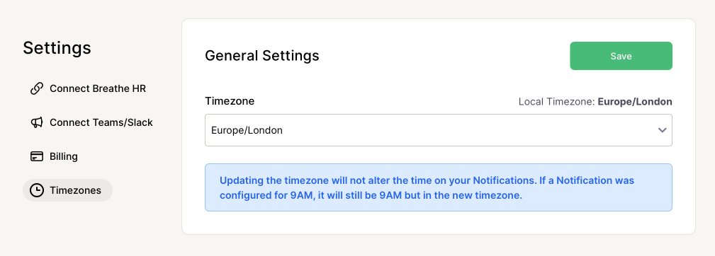 Head to Settings > Timezones. You can now select the preferred timezone from the dropdown and press the Save button.