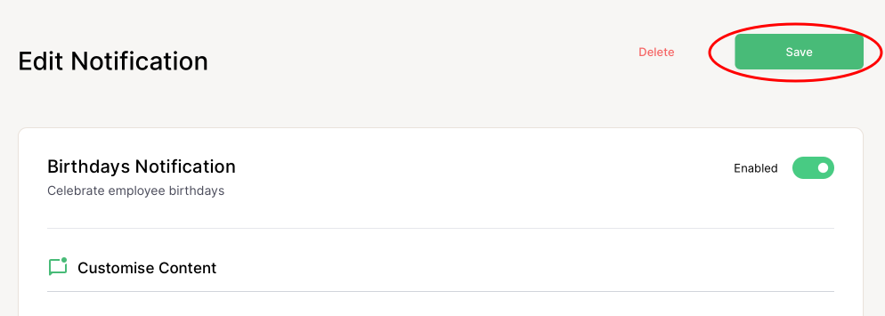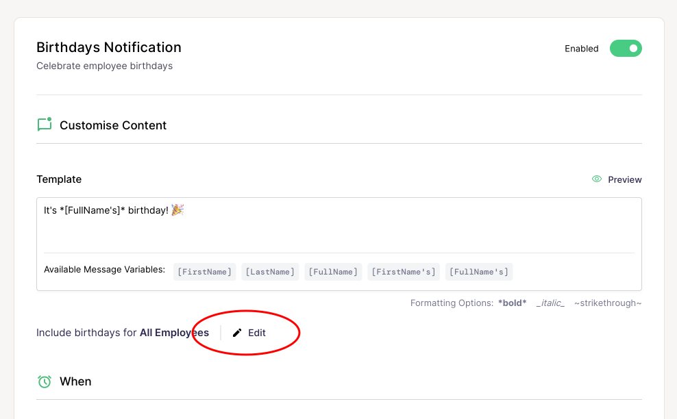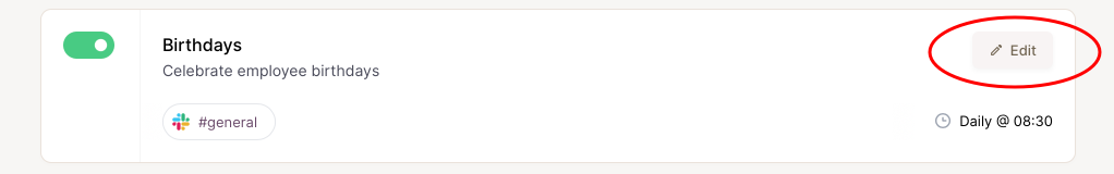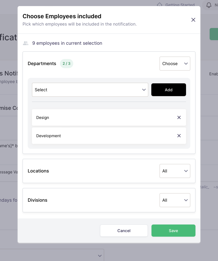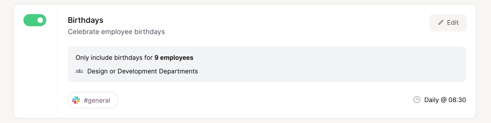 By default, all employees are included on a notification. For example, all birthday celebrations are sent to the same channel at the same time.