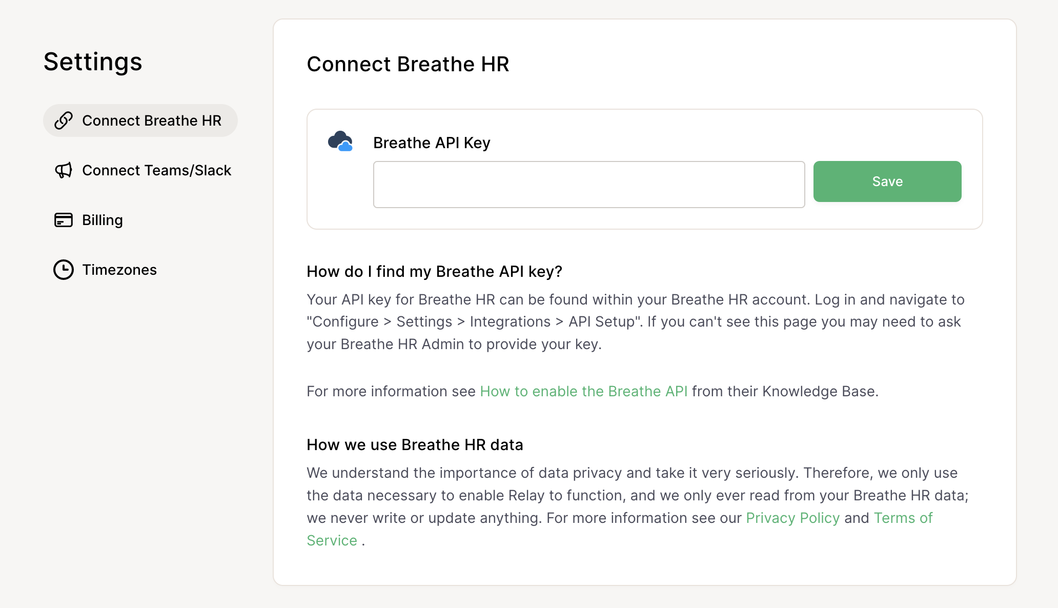 You'll also see details of the last time Relay synced with your Breathe HR account and how many employees were found.