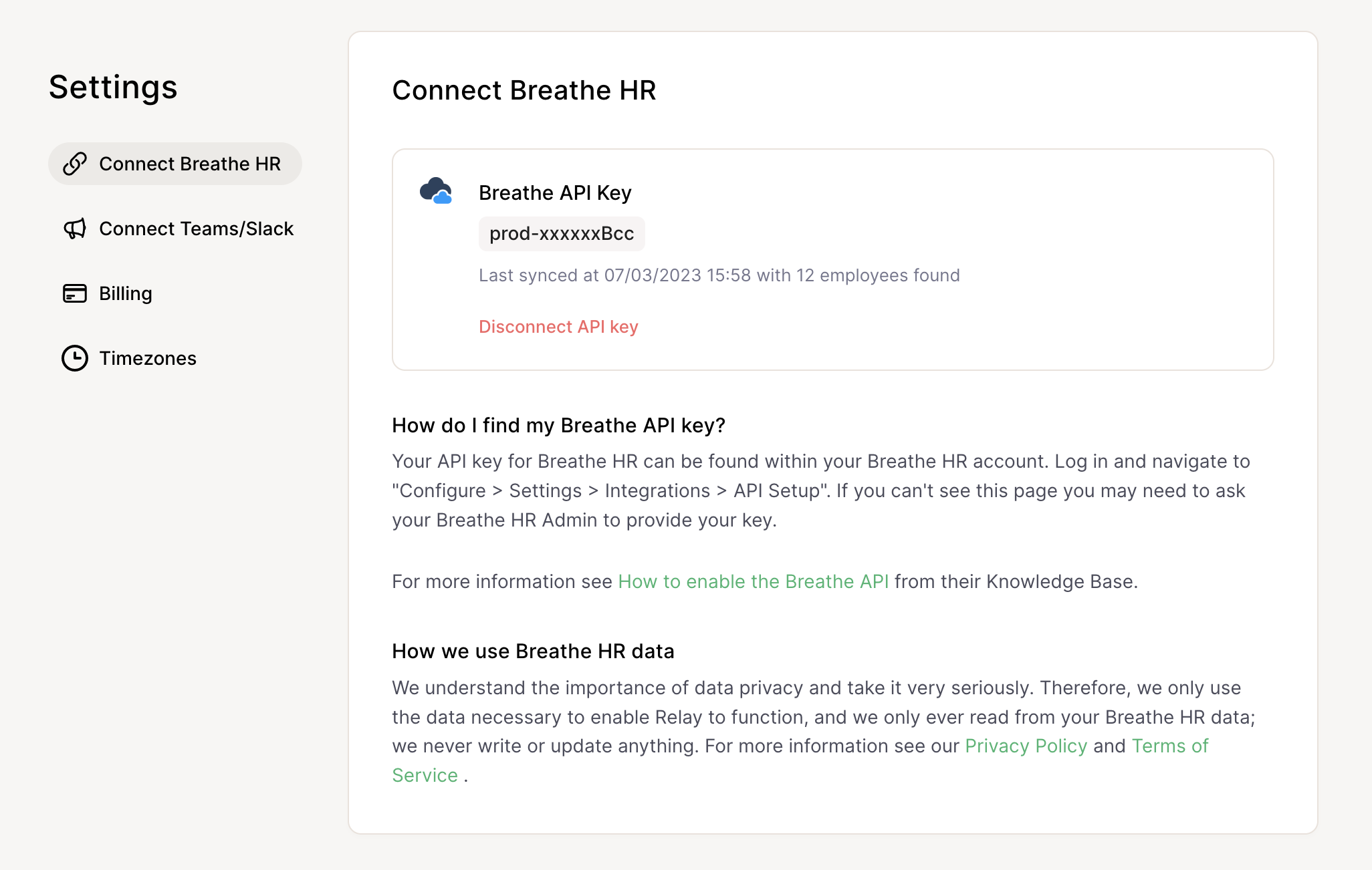 If you want to disconnect Relay from Breathe head to Settings > Connect Breathe HR and press the Disconnect API key link.